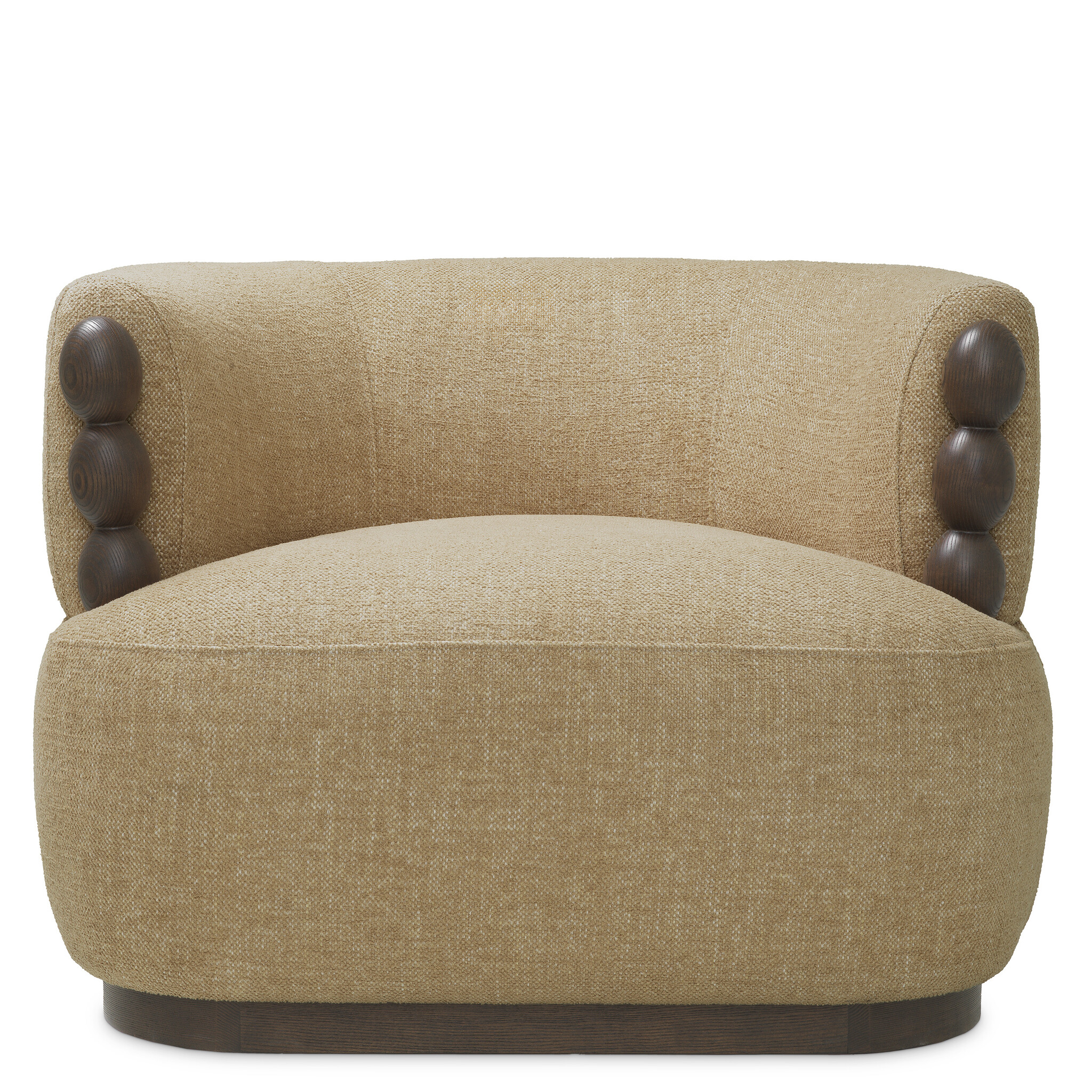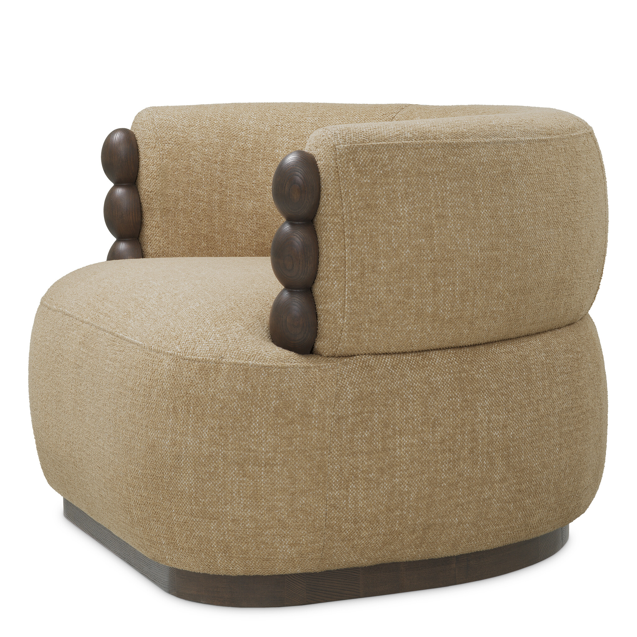 Upholstered in plush Renato fabric, its wooden accents bring a natural element, merging tactile comfort with understated luxury. The harmonious blend of rich textures and soft hues creates a captivating presence for discerning interiors.