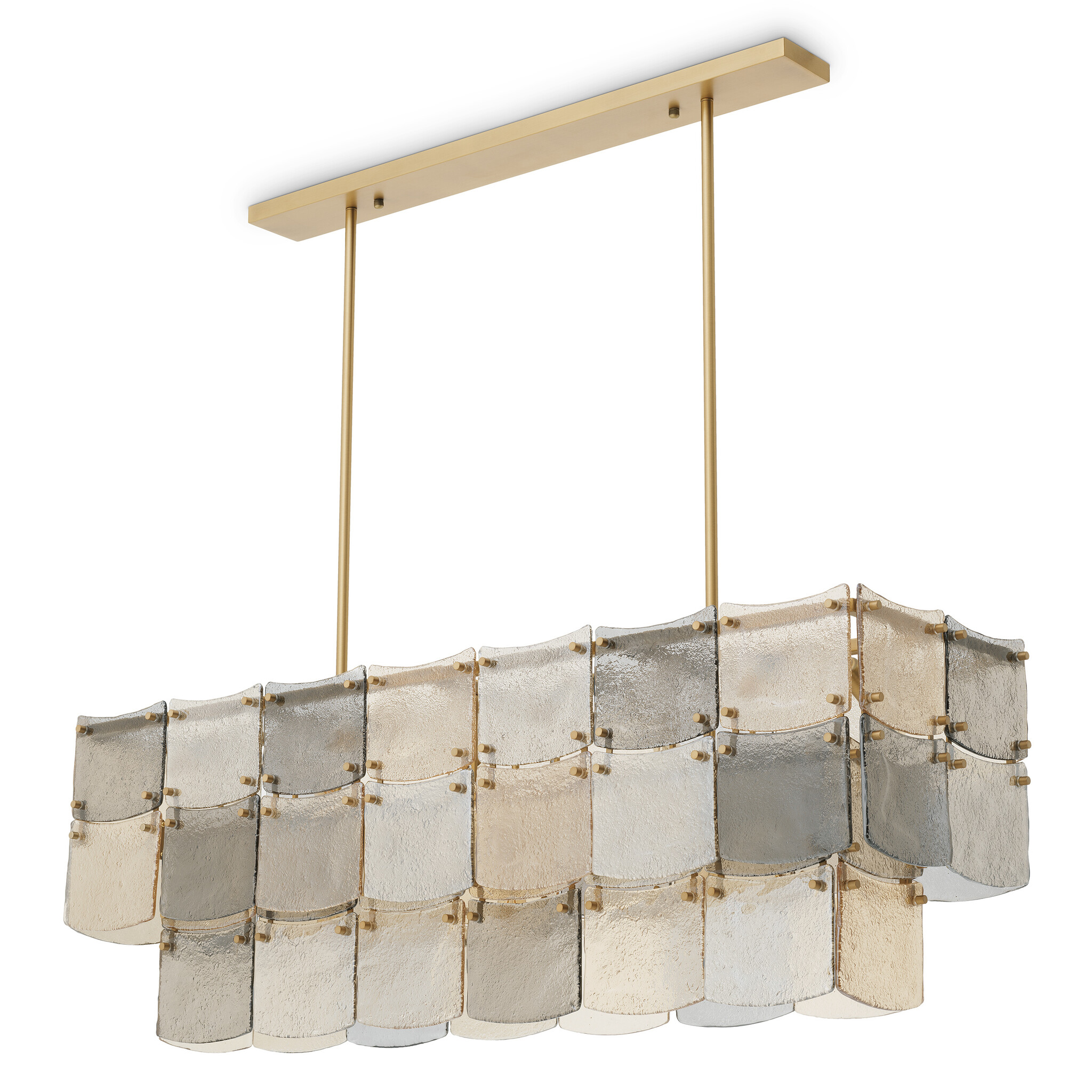 The Laurent rectangular chandelier features an antique brass finish with sleek lines.
