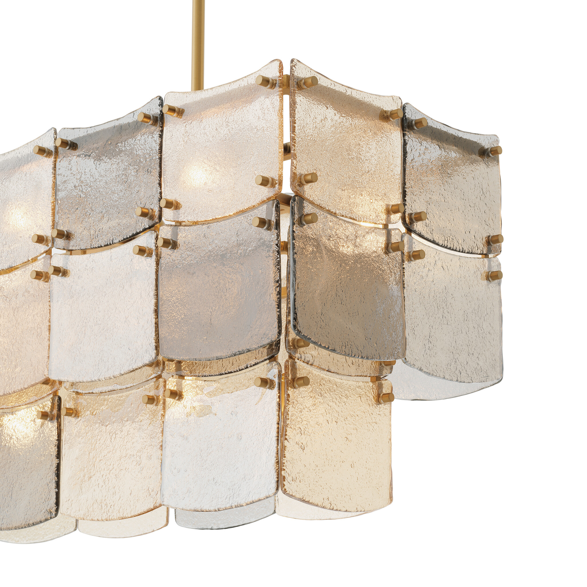 Its smoked glass and champagne glass panels create a warm, inviting glow, blending classic elegance with modern design for a striking, sophisticated lighting statement.