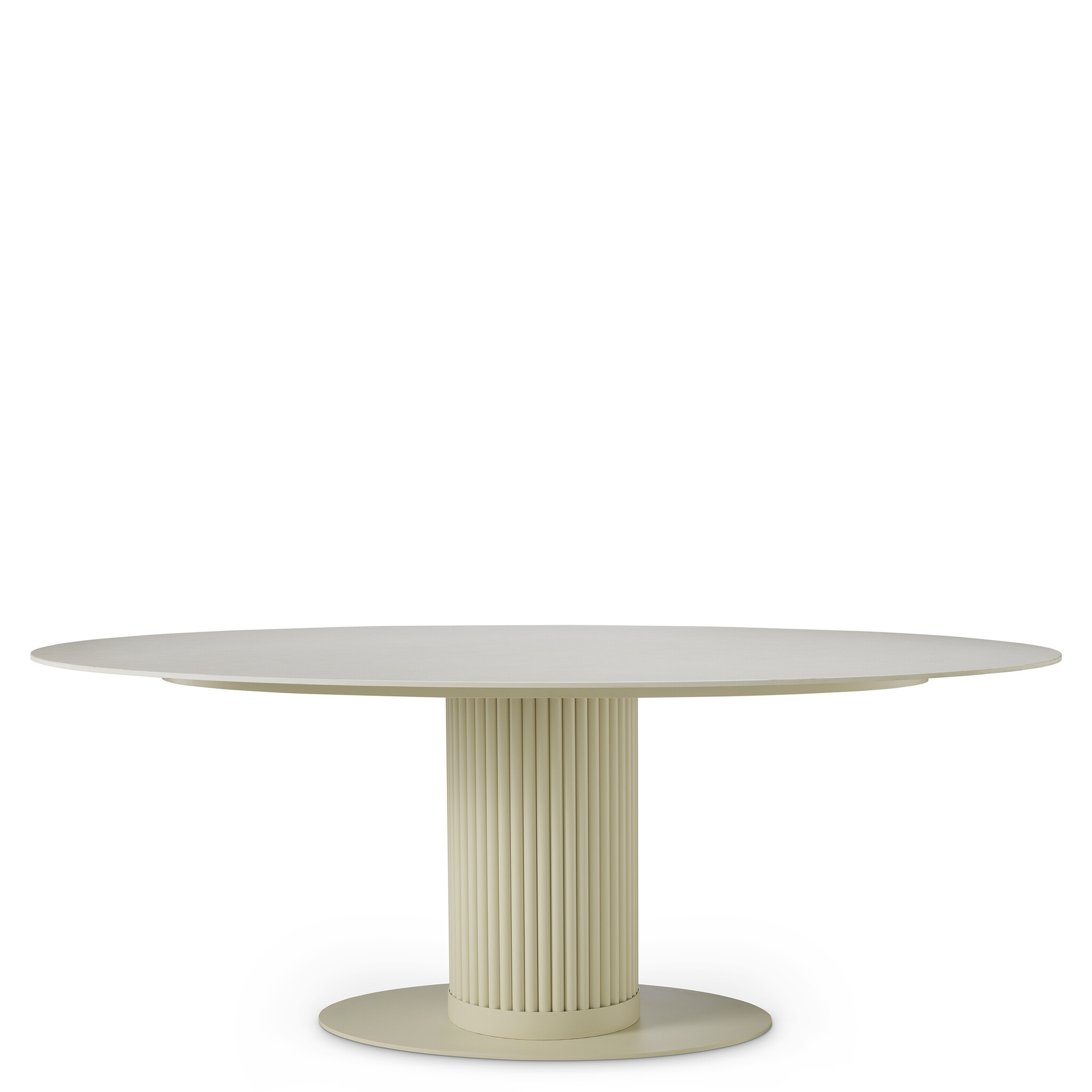 Unveiling the Volterra Oval Outdoor Dining Table, crafted from cream ceramic with a subtle sand finish, where gentle warmth meets refined elegance.