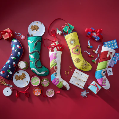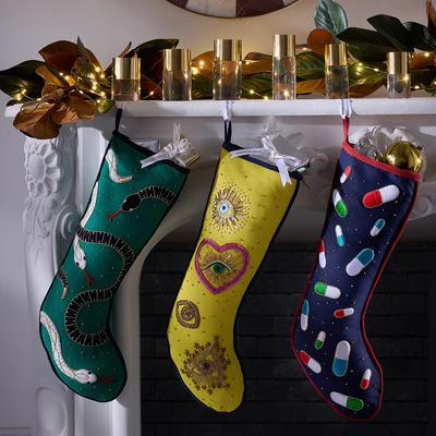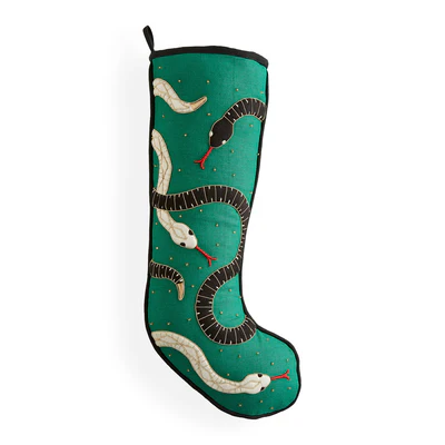 A striking addition to any mantel or holiday 'scape, our Eden Stocking features our signature slithering serpents rendered in glittering, dimensional beadwork and embroidery that pops on emerald linen. Its posh piped edge adds a tailored touch. Deep and stuffable with a loop for easy hanging by the chimney with care.