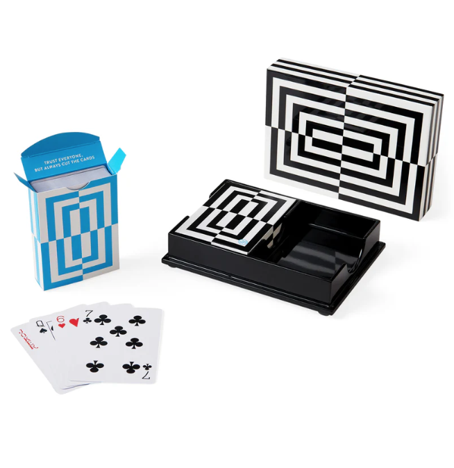 Elevate your evening entertainment with our Op Art Lacquer Card Set. Store your decks in a high-gloss lacquer box featuring our mind-bendingly mod design and score style points before you even start to play. A chic cocktail table accent on its Lees meer