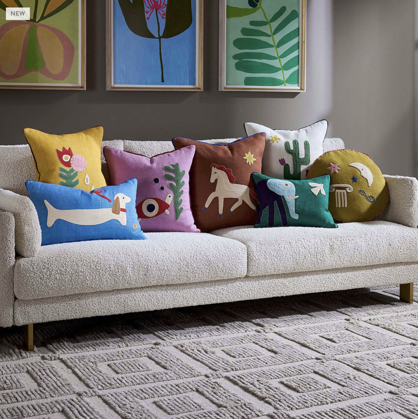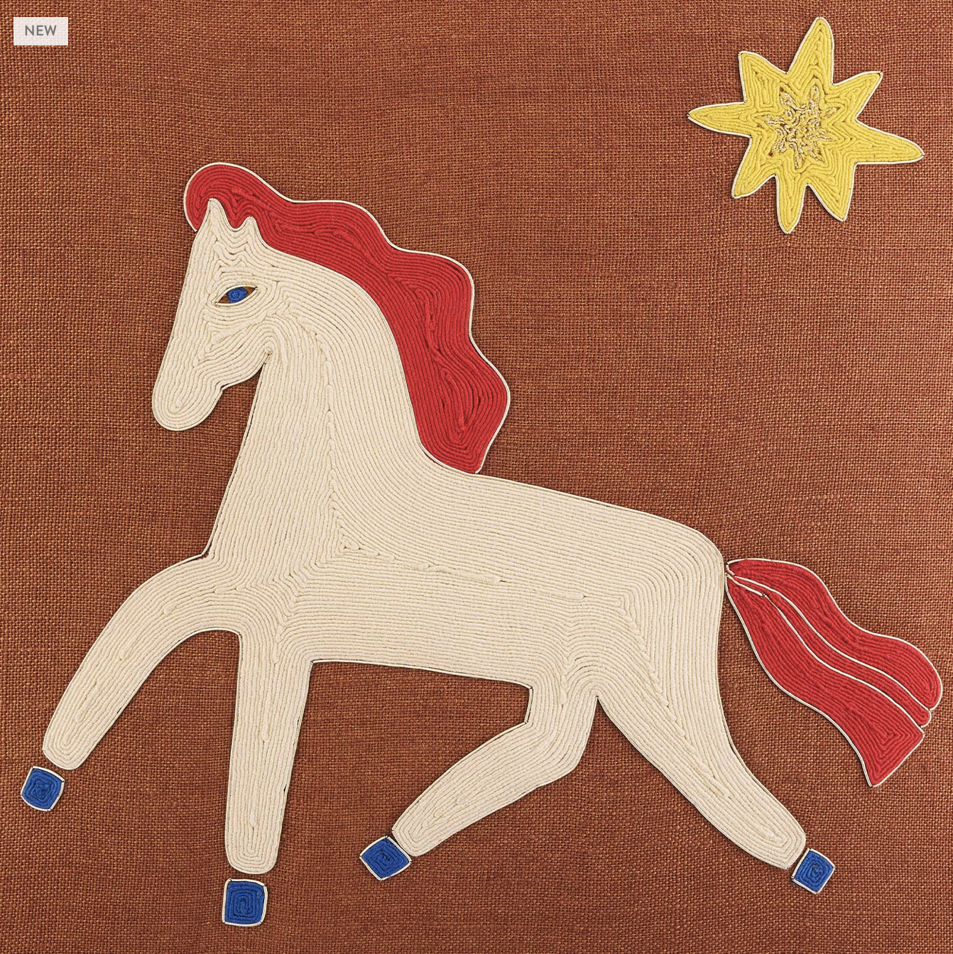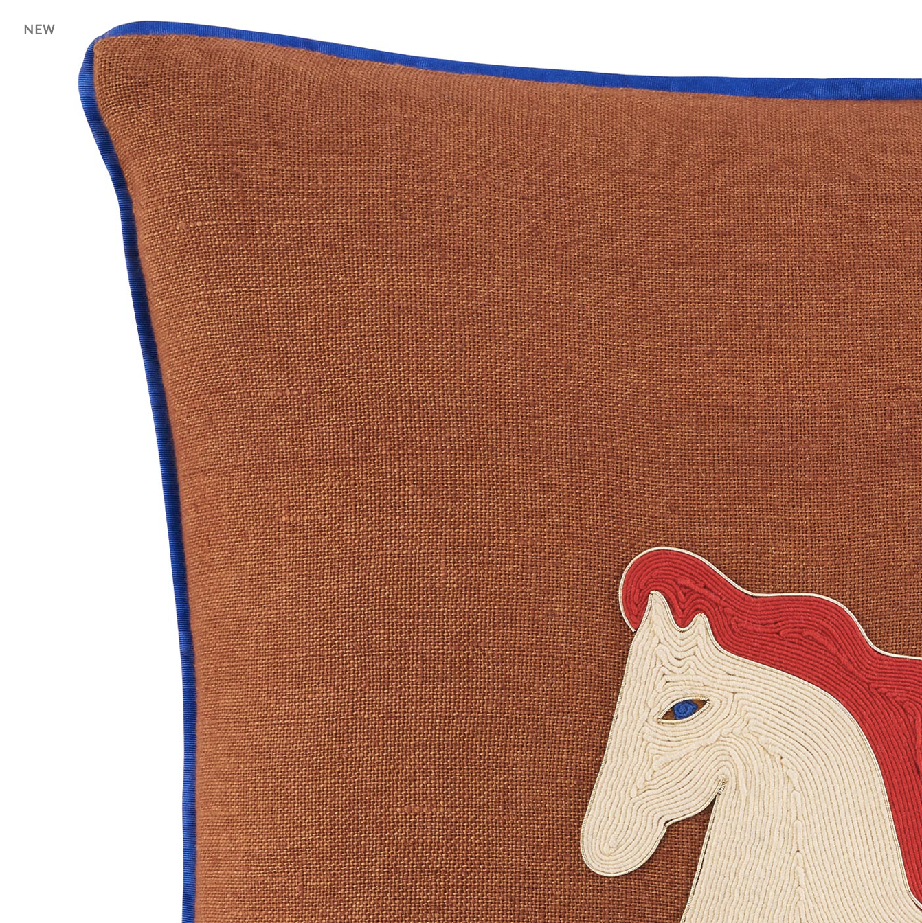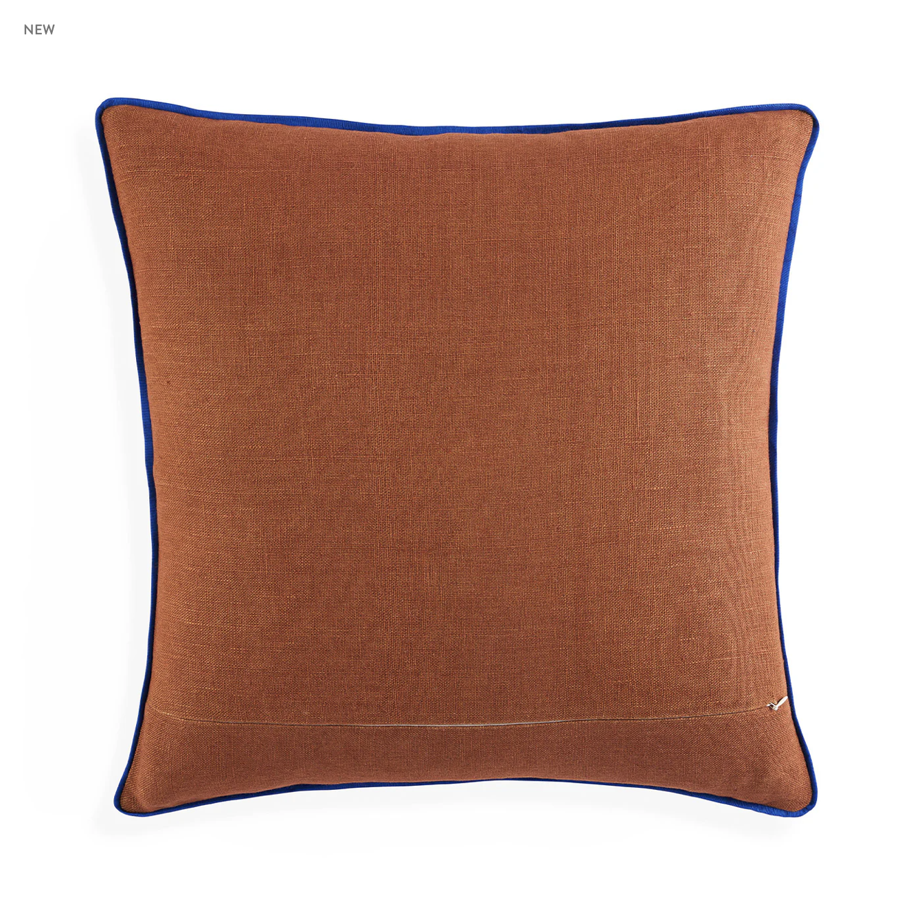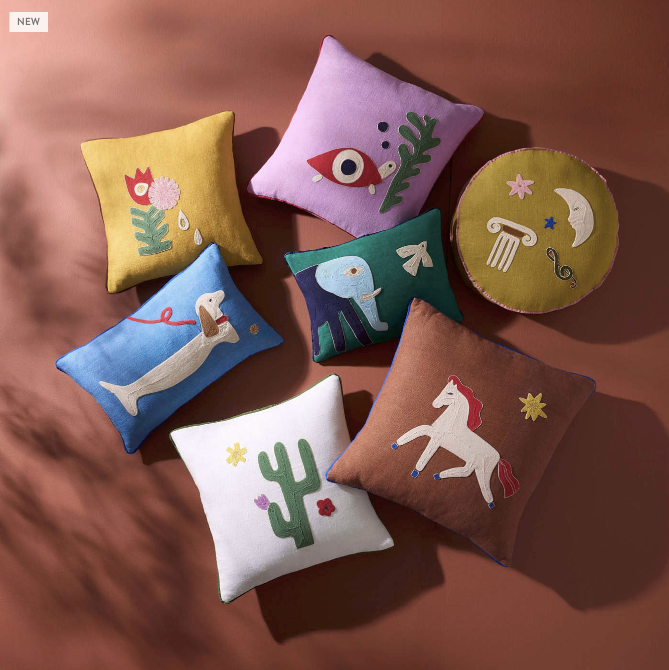 Evocative icons in a moody palette. Our new collection of Playa pillows feature concentric cord embroidery applied to dyed linen. Metallic gold thread outlining our graphics adds sparkle. Eye-catching accent pillows on their own, or gro