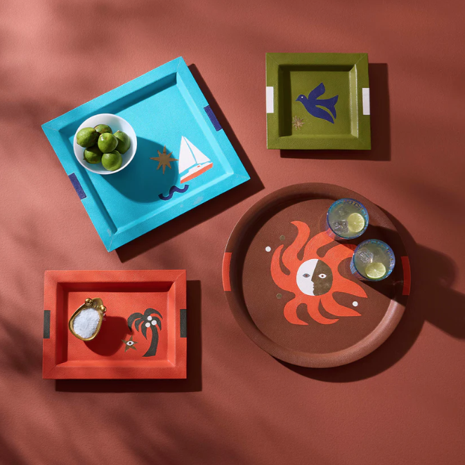 Adorned with evocative seaside icons in our moody Playa palette, our luxe leather clad trays have a soft, supple finish. Available in four sizes and shapes for mixing and matching, each features shimmering gold leather accents for a spot of glamour.