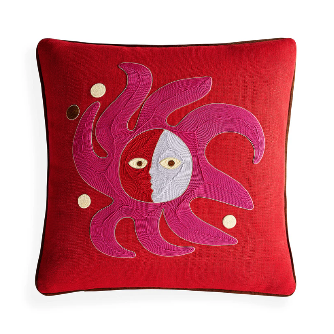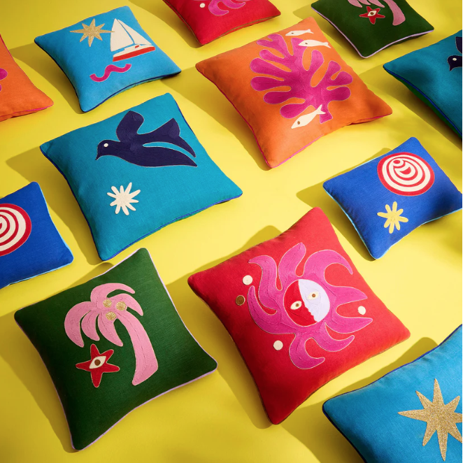 Evocative seaside icons in a bright palette—fresh, clean French 50s jet set glamour. Our Playa pillows feature concentric cord embroidery applied to dyed linen. Metallic gold thread outlining our graphics adds sparkle. Eye-catching acce