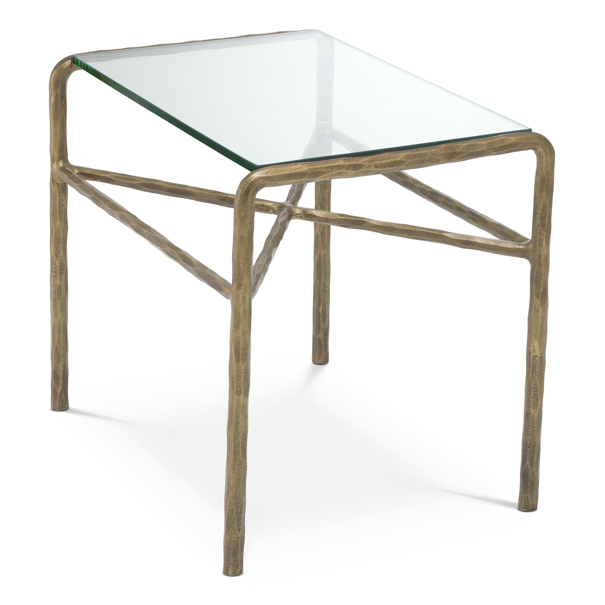 The Side Table Xandria features a clear glass top on a hammered vintage brass finish frame.