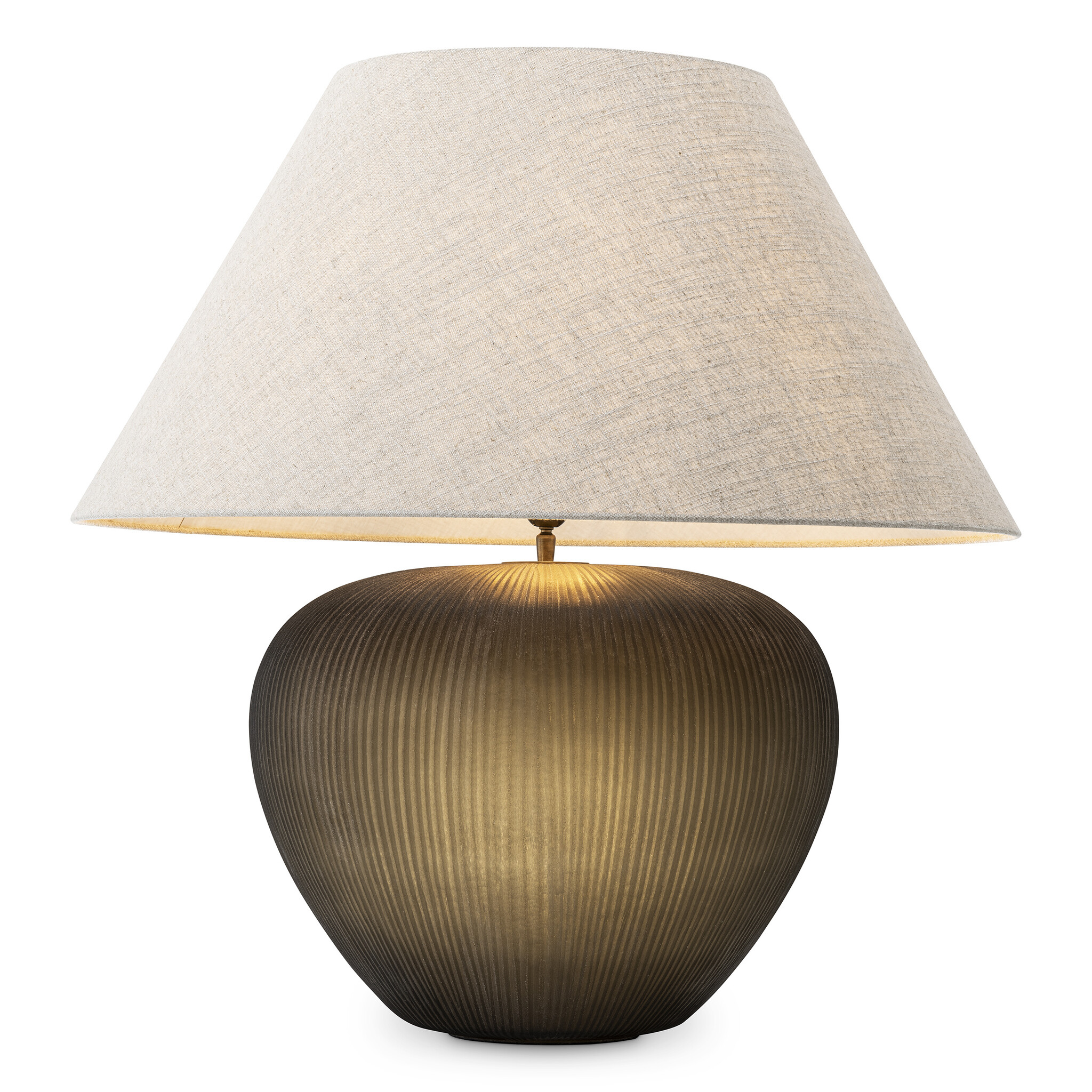 The base is handblown with handcut patterns. Each piece is unique, showcasing the artisan's touch in every detail. Topped with a softly textured linen-blend shade, it emits a warm, ambient glow that brings elegance and atmosphere to any interior. Perfect as a statement piece on a console, side table, or nightstand.